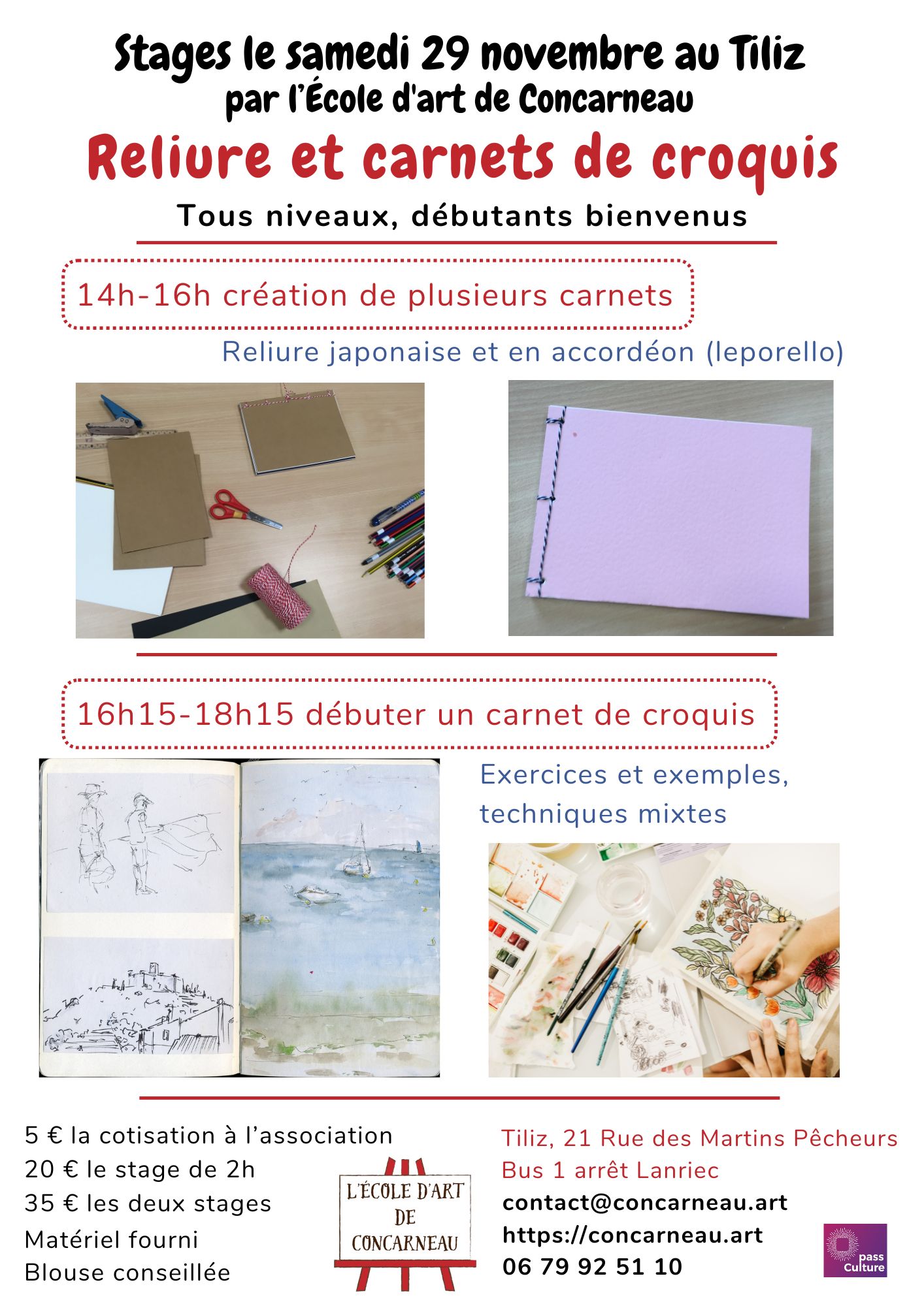 Nous organisons deux stages le samedi 29 novembre sur le thème du carnet, reliure et dessin.